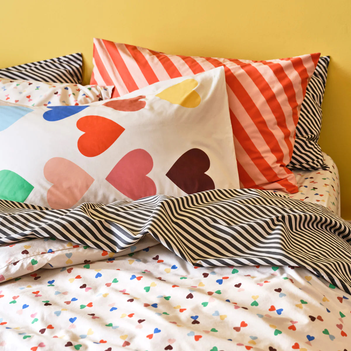 The 9 of Hearts Pillowcase from Castle brings a playful pop of colour to your bedroom with its vibrant and unique design. Made from 100% soft, breathable cotton, each standard-size pillowcase features a cheerful 9-colour print set against a warm eggnog base—creating a fun yet refined look that brightens any space. Perfect for mixing and matching or making a bold statement on their own, these pillowcases blend quality craftsmanship with Castle’s signature charm. Whether you're refreshing your bedding or adding a whimsical touch to a guest room, the 9 of Hearts set is designed to stand out while offering everyday comfort.
