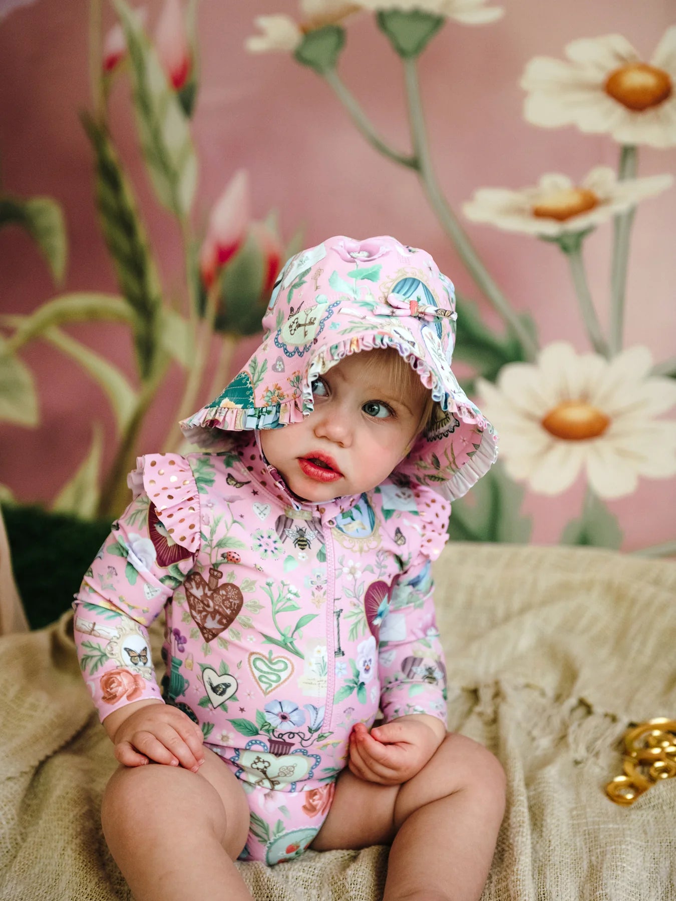 • Baby & kids’ swim hat in Fleur’s exclusive All My Hearts print