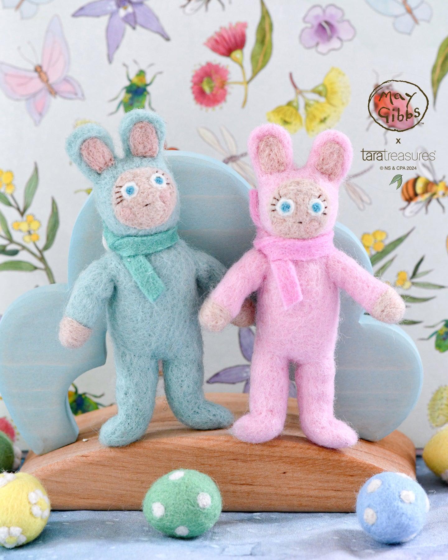Explore the captivating realm of May Gibbs™ as we bring to life the whimsical Bib and Bub in bunny suits. Inspired by the cherished characters from the enduring Australian children's tales, these charming felt toys encapsulate the wonder of the Gumnut Babies' escapades.