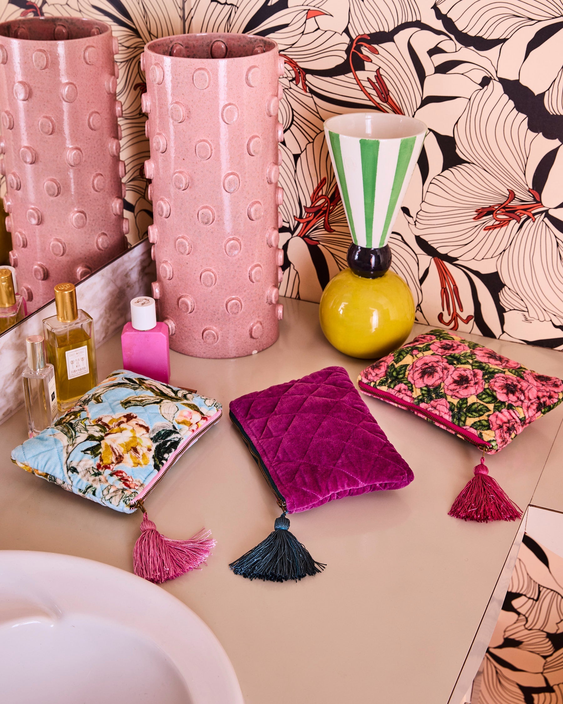 The Wild Grape Velvet Cosmetics Purse by Kip & Co is a luxurious and practical accessory that brings bold color and plush texture to your daily routine. This indulgent purple cosmetics bag features beautiful quilted velvet construction that feels soft to the touch while adding a premium, luxe aesthetic to your beauty storage. Perfect for organizing makeup, skincare essentials, or handbag accessories, this compact yet spacious cosmetics purse is designed to keep your items secure whether you're traveling or simply need stylish storage at home on your bathroom vanity.