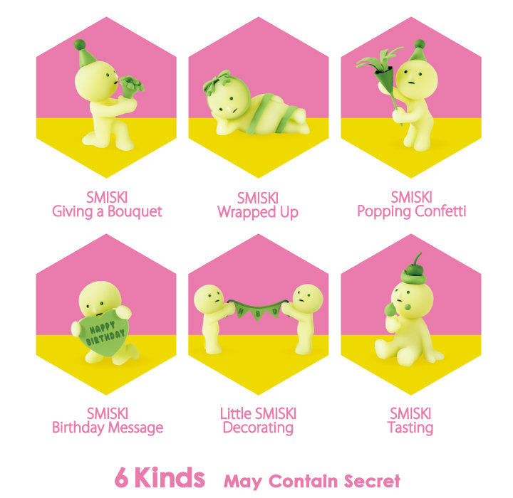 The lineup includes 6 kinds + 1 secret, such as the Smiski Birthday Message delivering heartfelt wishes, the Smiski Wrapped Up pretending to be a present with a ribbon, and the Smiski Tasting sneaking a bite of birthday cake.